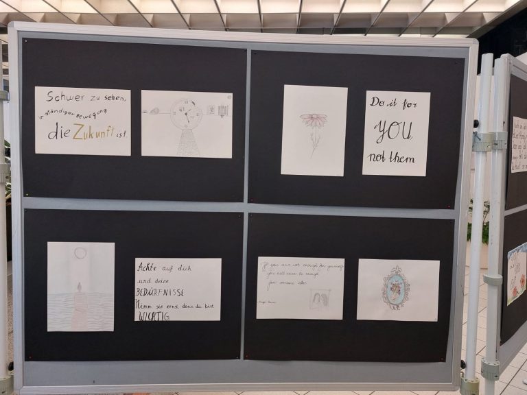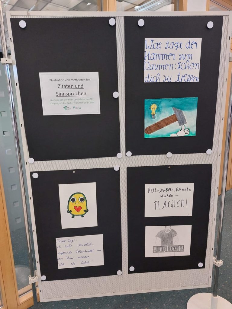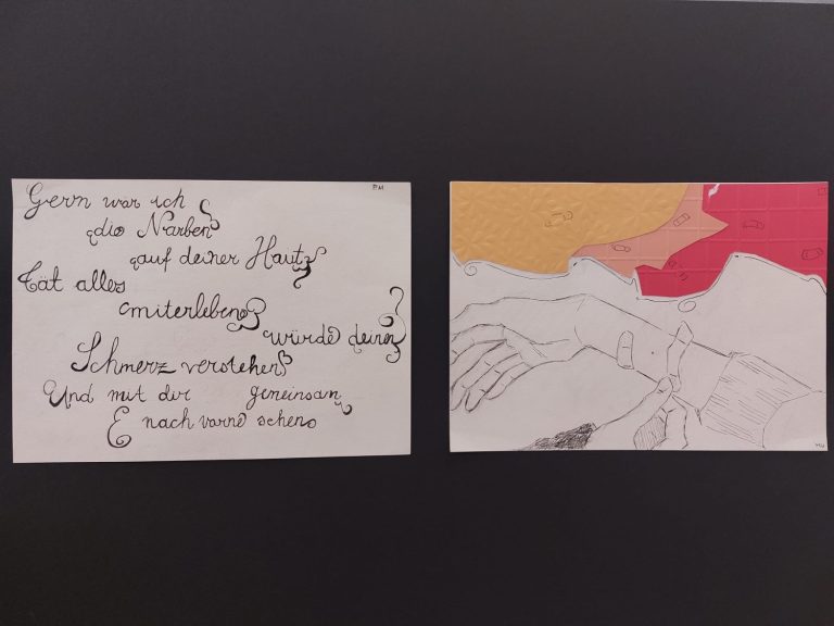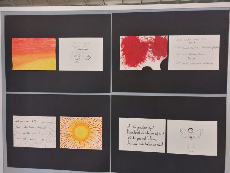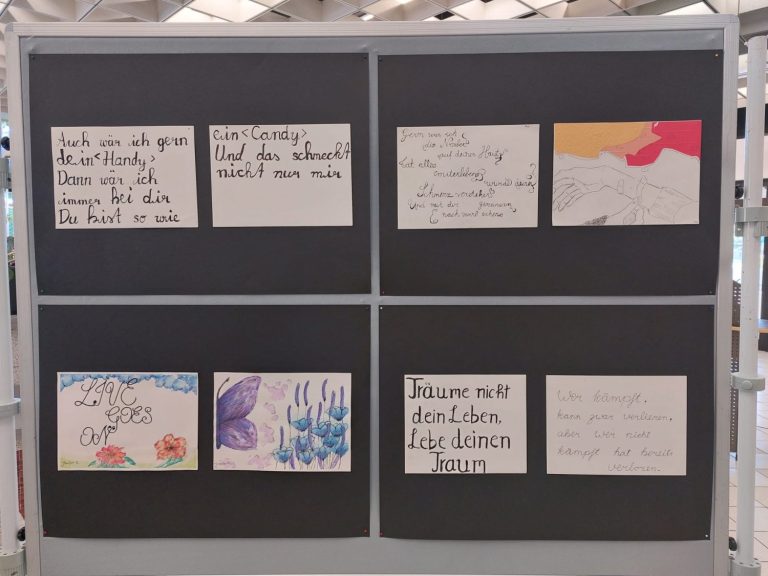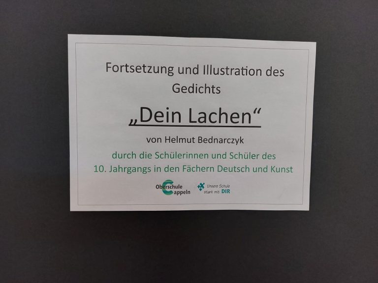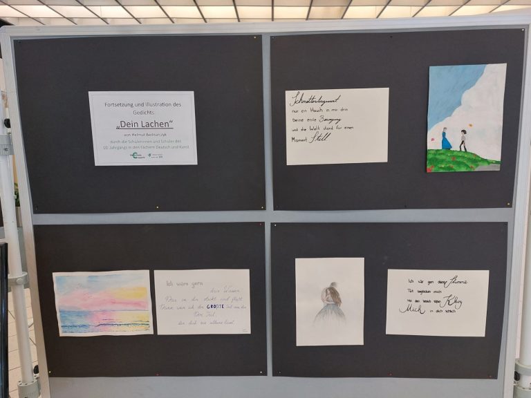 Die Grundidee zu diesem fächerverbindenden Projekt erwuchs spontan im Deutschunterricht des Erweiterungskurses der 10. Klassen. Während die Schülerinnen und Schüler sich mit der Interpretation von Liebeslyrik auseinandersetzten, sollten sie auch selbst sprachlich kreativ werden und das Gedicht „Dein Lachen“ von Helmut Bednarczyk um weitere Strophen eigenständig ergänzen. Entstanden sind dabei tiefgründige und metaphorisch verdichtete Liebesgedichte. „Die verfassten Ergänzungen sind wirklich eindrucksvoll und erzeugen emotionale innere Bilder beim Lesenden“, so Deutschlehrerin Katharina Arkenau, „und gerade deshalb bot sich eine künstlerische Gestaltung dieser Gedichte an.“ Kunstlehrerin Mareike Buken erklärte sich in ihrem Unterricht in der 10. Klasse sofort bereit, die Liebesgedichte mithilfe von kalligrafischen Schriftelementen und wunderschönen Zeichnungen auf unterschiedlicher Materialbasis visuell umzusetzen. So entstanden schließlich eindrucksvolle und sensibel ausgearbeitete Illustrationen, die die Gedichtinhalte gekonnt aufgreifen und widerspiegeln. Zudem illustrierten die Lernenden gekonnt motivierende Zitate und Sinnsprüche, die in den letzten Monaten vor den Abschlussprüfungen Inspiration und Stütze sein sollten.