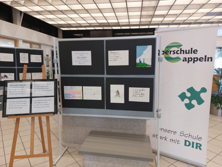 Wer zurzeit die Volksbank in Cappeln betritt, wird nicht nur die bekannten Automaten und Schalter erblicken, sondern auch bewegende Liebesgedichte lesen und dazu passende, wunderschöne Illustrationen sehen können. Schülerinnen und Schüler der 10. Jahrgangsstufe der Oberschule Cappeln haben diese Kunstwerke im Rahmen des Deutsch- und Kunstunterrichts entstehen lassen und nun ausgestellt.