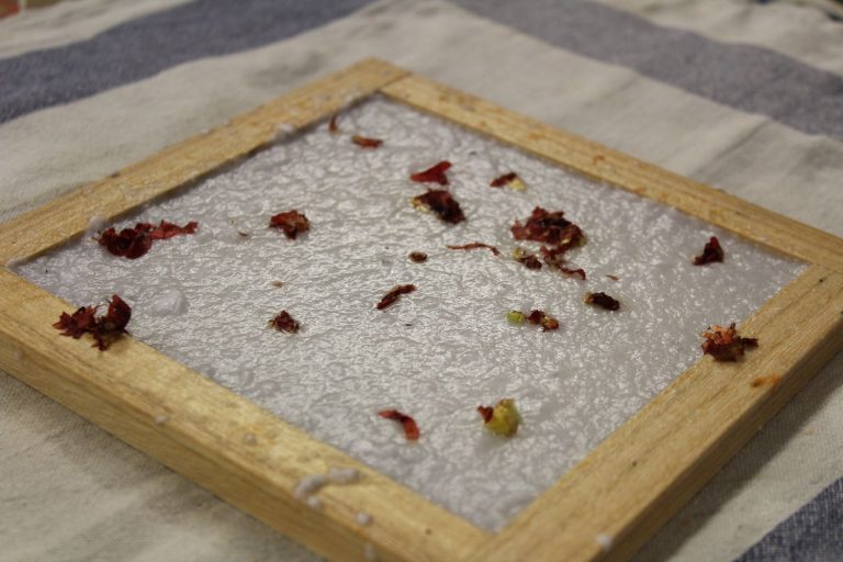 Normale Karten aus dem Geschäft findest du langweilig oder nicht nachhaltig genug? Dann hat diese Projektgruppe die richtige Lösung. Sie stellten aus alten Papierresten neues Papier her, aus dem man wiederrum Karten oder andere dekorative Dinge herstellen kann. Hierfür muss die Gruppe nur altes Papier sortieren und anschließend in grobe Stücke reißen. Danach wird das Papier in heißem Wasser eingeweicht. Nachdem das Papier lang genug eingeweicht wurde, kann man es umfüllen und anschließend pürieren. Nun wird das pürierte Papier in eine große Wanne gegeben und im folgenden Schritt mit einem feinen Sieb geschöpft. Sobald das geschöpfte Papier auf dem Sieb ist, legt man es auf ein Geschirrtuch zum Abtropfen. Jetzt kann man das Papier beliebig dekorieren, wie in unserem Fall mit Blüten, welche vorher zerkleinert wurden. Zum Schluss muss das Ganze nur noch trocknen und fertig ist das neue „alte“ Papier, welches man nun beliebig weiterverwenden kann.