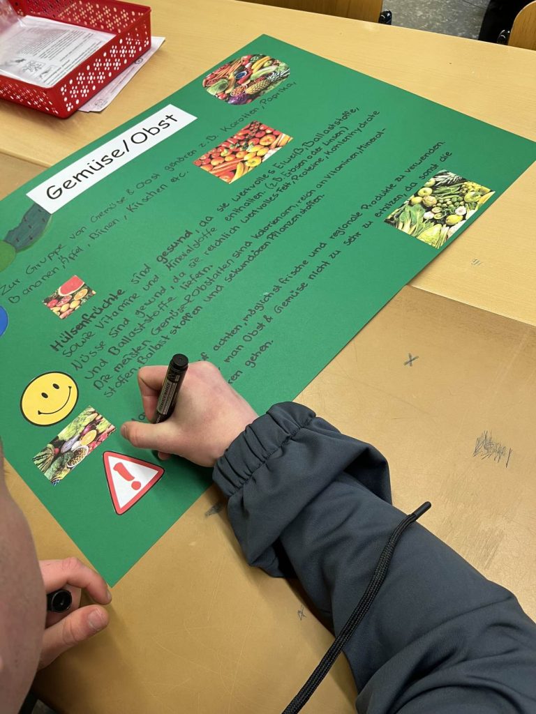 Die Schülerinnen und Schüler erarbeiten gemeinsam mit Frau Arkenau, wie man sich nachhaltig ernähren kann. Sie lernen, dass man nicht nur auf die Umwelt achten sollte, sondern auch auf den eigenen Körper. So sollte man z.B. auf die Herkunft der Lebensmittel achten und auf saisonale und regionale Produkte zurückgreifen. Saisonal bedeutet, dass man nach Saison isst, wie z.B. Erdbeeren im Sommer und nicht im Winter, da sie dann aus Spanien kommen. Regional dagegen bedeutet, dass man Lebensmittel kauft, die aus der Region kommen und nicht aus dem Ausland importiert werden müssen, damit unter anderem die Verkehrswege kürzer ausfallen und weniger CO2 produziert wird.