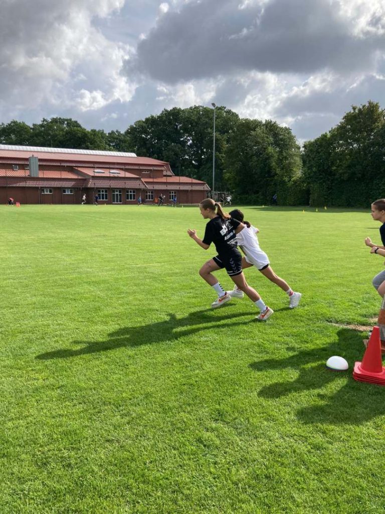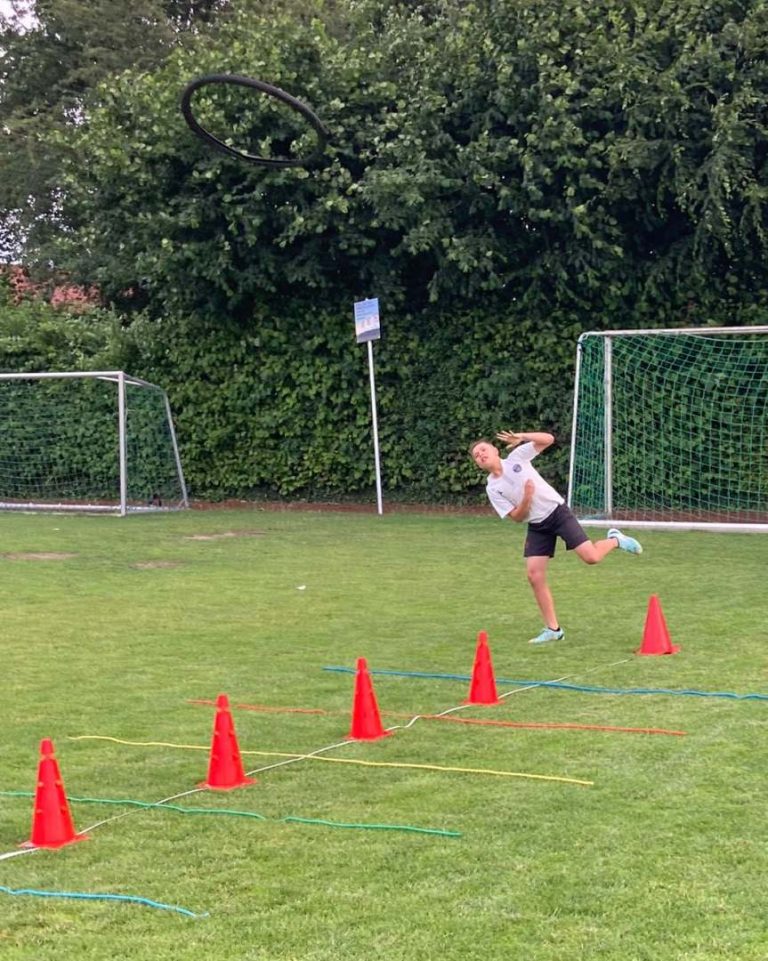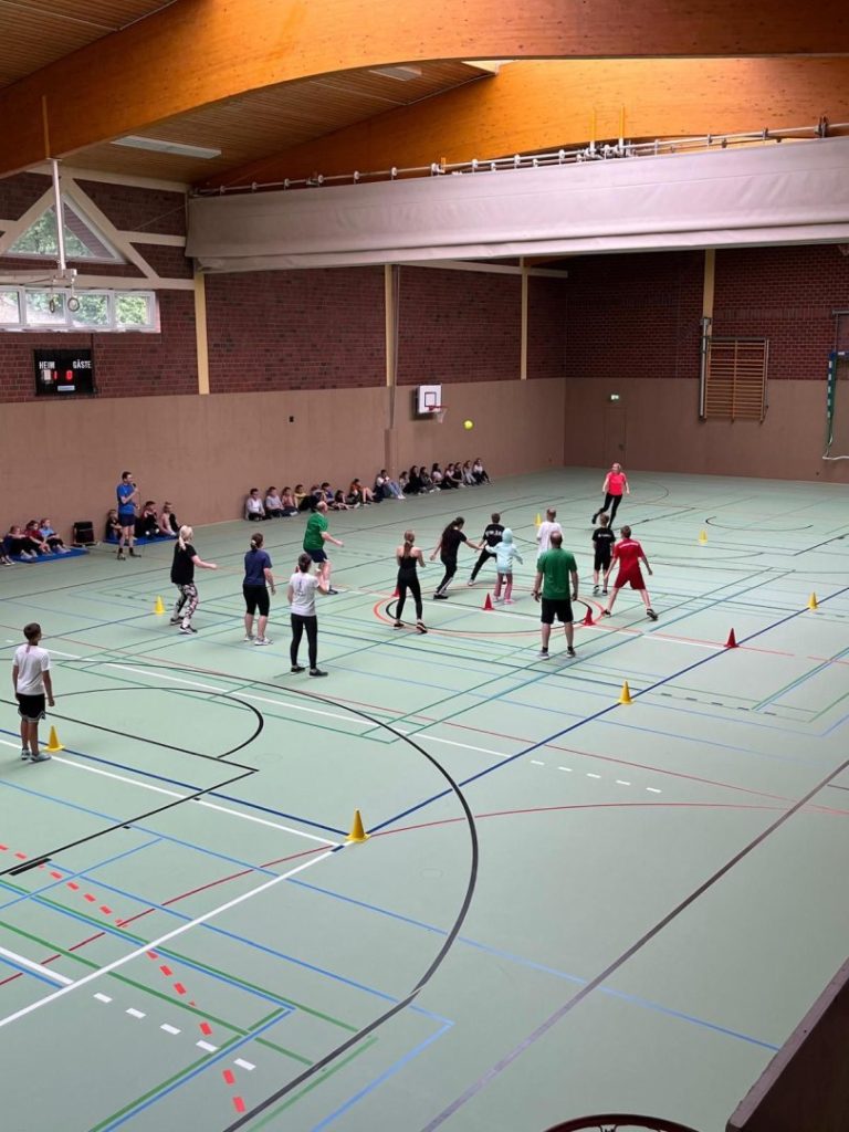 Am Montag, 3. Juli 2023, zeigten die Klassen des 7., 8. und 9. Jahrgangs ihre sportliches Leistungsvermögen. In der Wendestaffel hieß es: Hindernisse überspringen, im Slalom zurück und das auf Zeit. Statt Bälle wurden Fahrradreifen in Zonen geschleudert und beim Springen war erst das Hüpfen in fünf Reifen gefordert: rechts, rechts, links, links, bevor mit dem rechten Bein dann der Sprung in die Grube erfolgte. Am Dienstag, 4. Juli, folgten die Klassen 5 und 6 mit den Disziplinen im angepassten Aufbau für die jüngeren Klassen. Beim 8-Minuten-Lauf wurden Kronkorken gesammelt, mit denen nachher die gelaufenen Runden gezählt wurden.