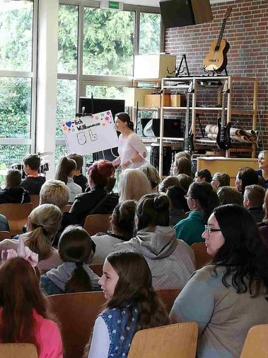 Am Donnerstag, den 15. August 2019, wurden um 10.00 Uhr die 52 Schülerinnen und Schüler der 5. Klassen durch die Schulleiterin Petra Brokamp willkommen geheißen. Eingeladen waren auch die Eltern der Kinder, die zahlreich erschienen sind. Die Einschulungsfeier wurde maßgeblich von den Schülerinnen und Schülern der Chor- und Sketch- AG unter der Leitung von Frau Nicole Dockmann durch eine humorvolle Musicalaufführung gestaltet. Die Klassen 6a und 6b und ihre Klassenlehrerinnen Frau Meike Meyenburg und Frau Sandra Luttikhuis begrüßten die „Neuen“ mit einem kleinen Willkommenspräsent.