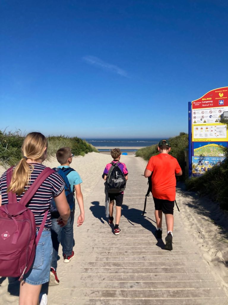 Zahlreiche Sponsoren hatten dankenswerterweise diesen Tag finanziell unterstützt, damit alle Kinder mitreisen konnten. Unter der Schülerschaft gab es eine große Anzahl, die noch nie eine ostfriesische Insel besucht haben oder überhaupt mit einer Fähre gefahren sind. Für diese Kinder war der Tag ein ganz besonderes Erlebnis, stellt Petra Brokamp fest. Aber auch alle anderen erlebten einen ereignisreichen Ausflugstag. Nach der Rallye war es den Schülerinnen und Schülern freigestellt, ihre Zeit in der Ortsmitte oder am Strand zu verbringen. Das auflaufende Wasser und eine kleine Brise waren eine willkommene Abkühlung bei den heißen Temperaturen. Am Strand wurden Muscheln gesammelt, Schriftzüge in den Sand geschrieben und Watttiere beobachtet. Die Schülerinnen und Schüler, die sich im Ortskern tummelten, nutzen die Gelegenheit etwas zu essen oder nach Souvenirs zu suchen. Viele Langeoogurlauber wurden auf die große Schülergruppe aufmerksam und staunten über die Organisation eines solchen Projektes.