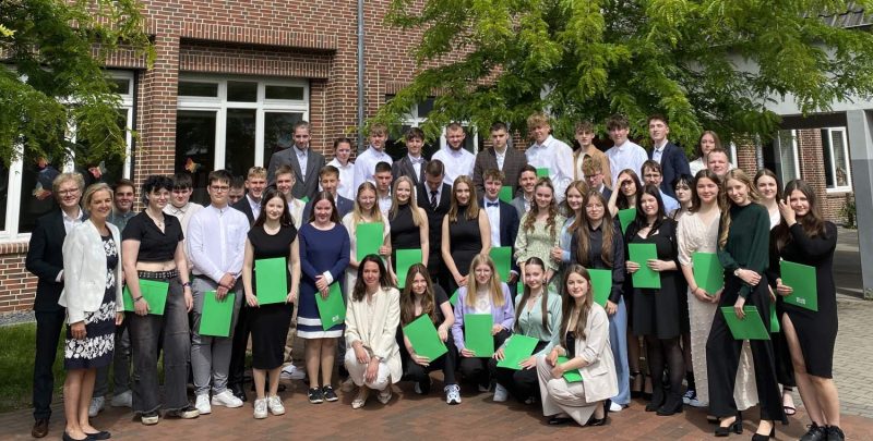 Insgesamt freuten sich 45 Absolventen der 9. und 10. Klassen über die bestandenen Prüfungen. Im Jahrgang 10 wurde von 62% der Schülerinnen und Schüler der erweiterte Realschulabschluss erreicht. Als Klassen- bzw. Jahrgangsbeste wurden Lukas Neteler mit dem besten Zeugnise, Diana Prüse und Andreas Holstein besonders ausgezeichnet. Ebenfalls wurden die Schüler Marcel Büldt, Joel Hoffmann, Lena Mantai, Diana Prüse, Marcel Galla, Milan Höne und Leonhard Sonntag für ihr soziales Engagement für die Allgemeinheit geehrt.
