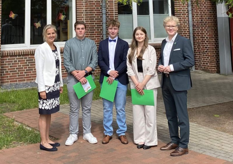 Foto (Bilder Beste) von links (gemacht von Vera Kruse): Schulleiterin Petra Brokamp, Andreas Holstein, Lukas Neteler, Diana Prüse, Bürgermeister Marcus Brinkmann
