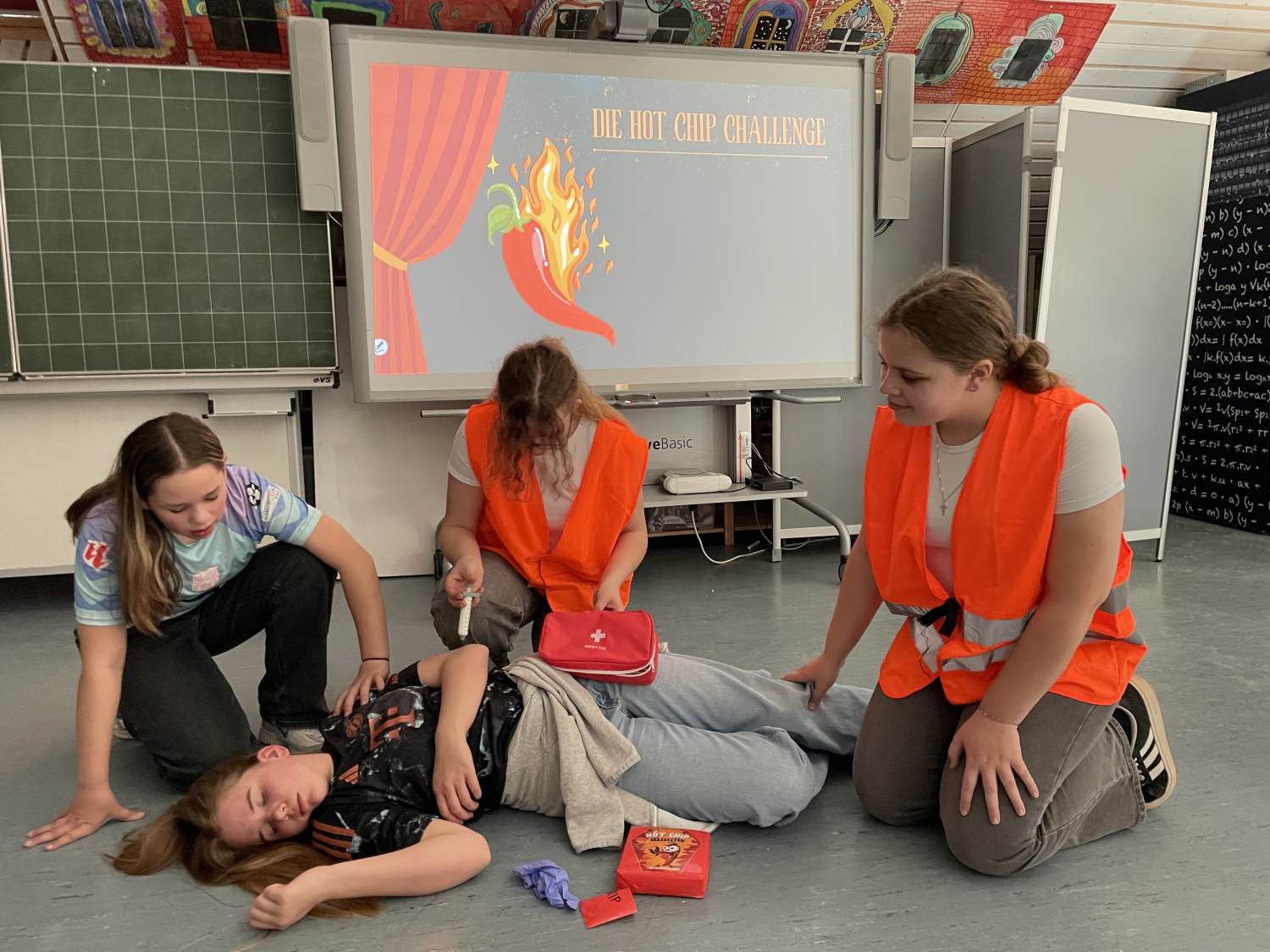 Die Jahrgänge 5 und 6 näherten sich den Inhalten auf besonders kreative Weise. Ein Highlight war der Auftritt des Theaterkurses des 6. Jahrgangs. Unter dem Motto „Vorhang auf“ präsentierten die Schülerinnen und Schüler ihre selbstgeschriebenen Stücke, in denen sie eigene Erfahrungen verarbeiteten. Themen wie Fake-Profile, Missverständnisse in WhatsApp-Gruppen, Onlinesucht und fragwürdige TikTok-Challenges wurden eindrucksvoll auf die Bühne gebracht.